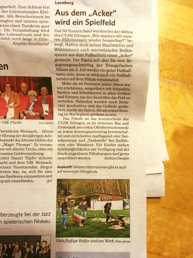 An dieser Stelle möchten wir euch alle möglichen Infos betreffend unserem Begegnungsnachmittag mit Fußballturnier zukommen lassen! Haltet euch den 2. Juli ab ca. 14 Uhr frei und kommt aufs Plätzle (CVJM Heim Tiefenbach)! Veranstalter: Die Evangelische Allianz in Leonberg lädt ein Gemeinschaft zu erleben und Begegnungen zu genießen. Wir als CVJM Eltingen stellen den Platz,…